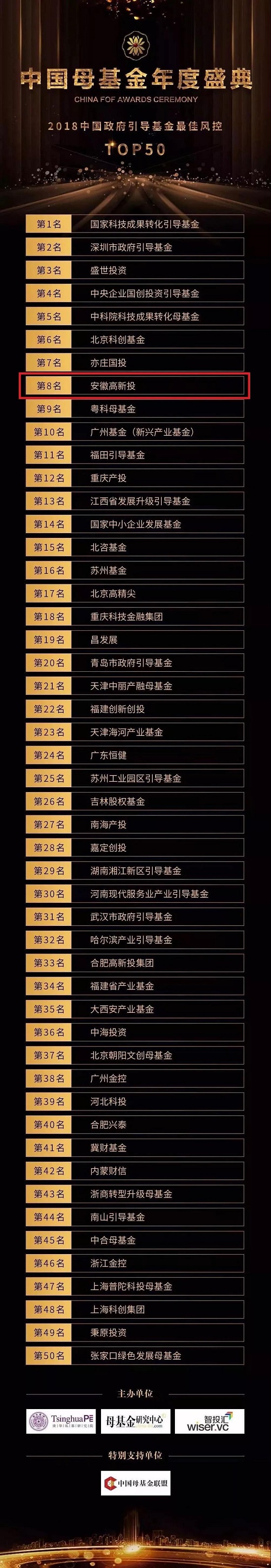 9月21日,由清华大学全球私募股权研究院、母基金研究中心联合主办的中国母基金年度盛典在北京成功举办。会议期间,发布了金汇奖榜单,安徽省高新投公司荣登“2018中国政府引导基金最佳风控TOP50”第八名。本次入选“2018中国政府引导基金最佳风控TOP50”榜单的母基金机构包括国家科技成果转化引导基金、中科院科技成果转化母基金、中央企业国创投资引导基金、深圳市政府引导基金等多家知名母基金机构,榜单由中国母基金联盟80余家工作协调机制成员单位打分评出,在一定程度上反映了现阶段国内母基金风控管理情况。