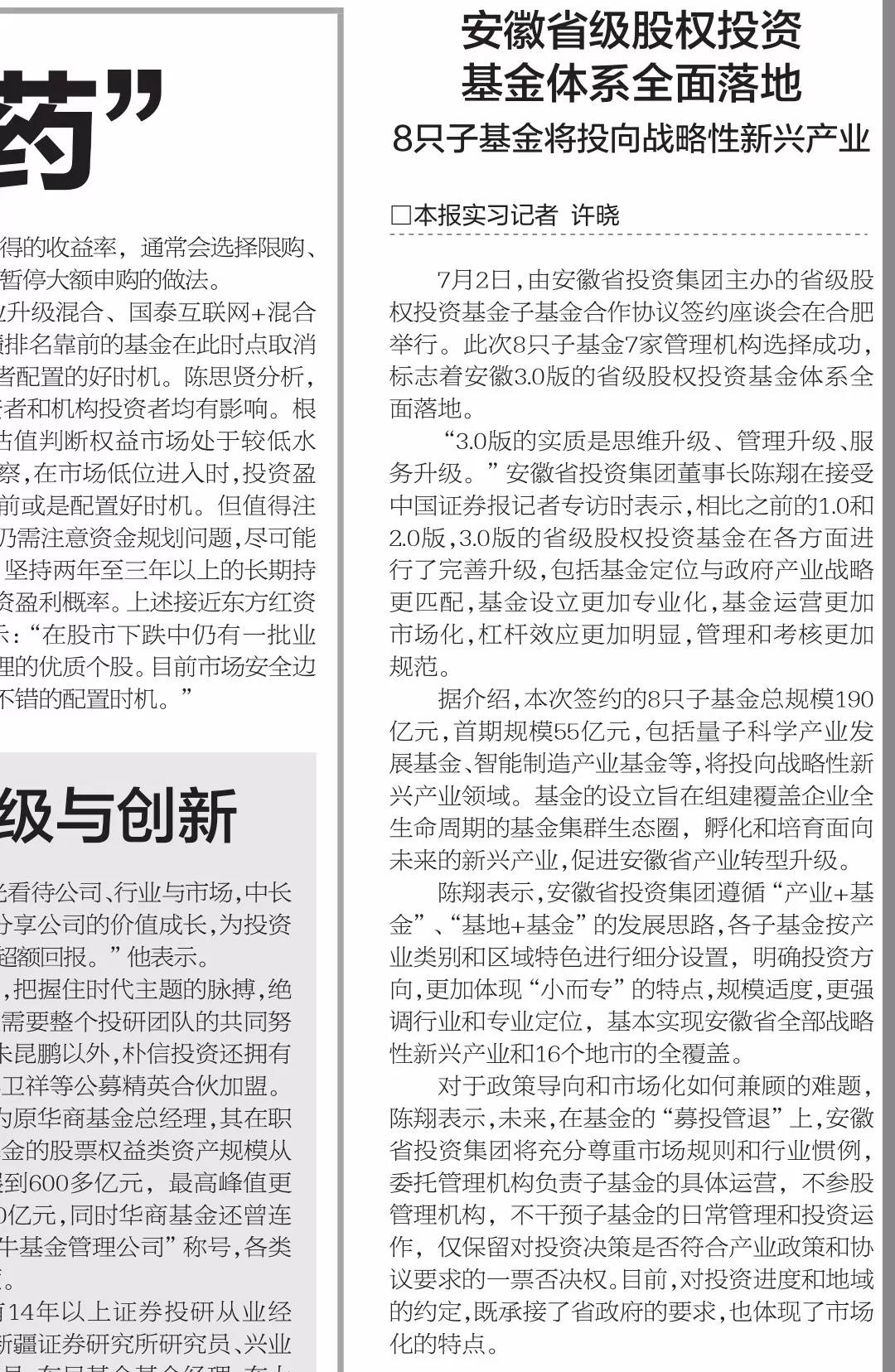 7月5日的《中国证券报》第7版刊发题为《安徽省级股权投资基金体系全面落地》的新闻报道。